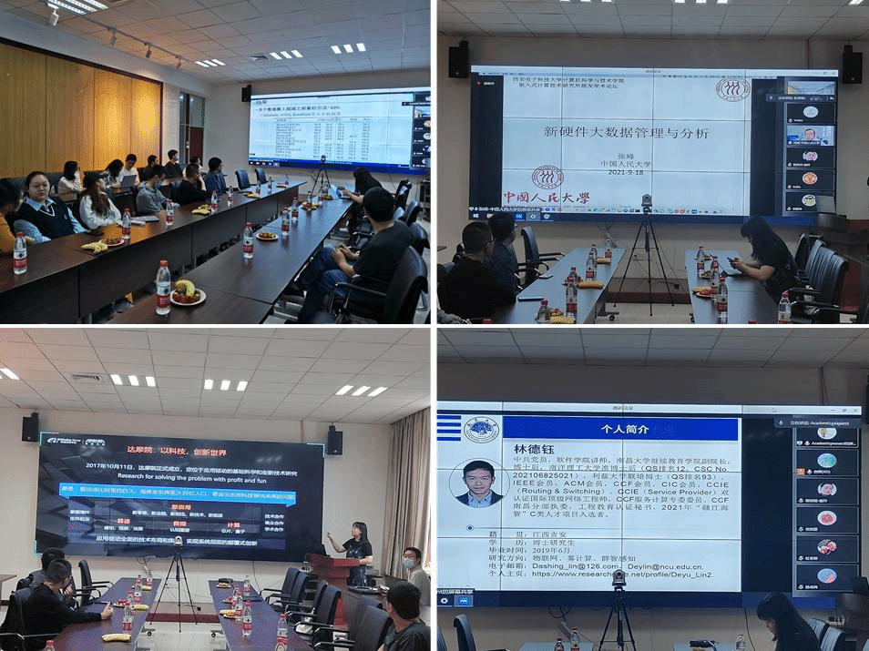 南开大学程明明教授、中国人民大学张峰副教授、阿里巴巴达摩院视觉技术高级算法专家唐铭谦、南昌大学继续教育学院副院长林德钰博士、我校beat365亚洲体育官方网站讲师黄钊博士先后带来了精彩的报告。程明明教授就大规模图像的多粒度目标检测进行了详细的报告,阐述了从实例、图像、以及整个数据集三个粒度出发,对大规模图像集合进行联合分析,以减少图像理解算法对大规模精确标注依赖的过程。张峰副教授以新硬件大数据管理与分析为主题,并结合大数据管理技术正经历以软件为中心到以数据为中心的计算平台变迁的时代背景,重点关注新型硬件环境给大数据管理与分析领域带来的机遇与挑战,介绍了混合异构硬件环境下大数据应用加速的最新研究进展。阿里达摩院视觉技术高级算法专家唐铭谦介绍了视频内容结构化、多模态搜索、视频场景下内容合成,结合媒体AI及AI编辑部产品,赋能融媒体应用的最新进展。随后,林德钰博士简单综述了万物感知及互联、数能一体化通信的相关进展,深度剖析了两者有机结合存在的重要挑战,理性分析并指出了其科学合理的解决方案。黄钊博士以新时代下"硬件安全"前沿研究技术分享为主题,从可靠和安全两个维度出发,针对物联网等典型应用,探讨了可靠芯片的安防检维技术,深入分析了"硬件安全"问题产生的背景以及目前主要的防护手段和策略。参加论坛的师生与报告嘉宾就相关技术难点和个人职业规划问题进行了深入交流。