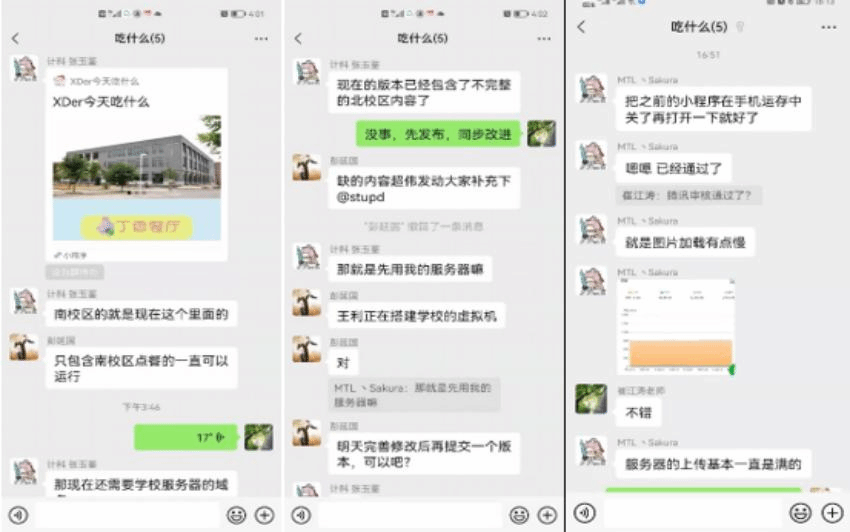 针对小程序运行之初,访问带宽受限、并行处理能力弱、小程序发布审核时间久等问题,beat365亚洲体育官方网站崔江涛教授、彭延国副教授带领研究生一起帮助张玉鉴加班加点提供解决方案,设计了支持高并发的部署方案,统筹协调计算中心开辟了专用虚拟服务器资源,争分夺秒完成了应用迁移,同时联系腾讯公司加速小程序审核,确保了“XDer今天吃什么”小程序及时发布。目前云选餐服务可以正常使用,后续将根据同学们的建议进一步完善相关功能。