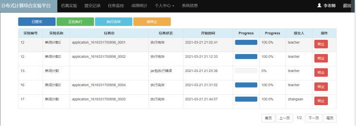 李龙海老师主持的“分布式计算课程综合实验平台”项目,设计并实现了一个能够支撑多人同时在线完成分布式数据处理实验的平台。学生可以将自己设计的分布式算法程序通过网络提交至系统,然后以多人共享方式利用平台的服务器集群资源运行程序并验证实验结果。平台还支持实验过程监控、实验结果自动评判和实验情况统计等功能,进一步减轻了指导教师的工作量。该平台在我院本科生分布式计算课程的部分班级进行了试用,取得了良好的教学效果。