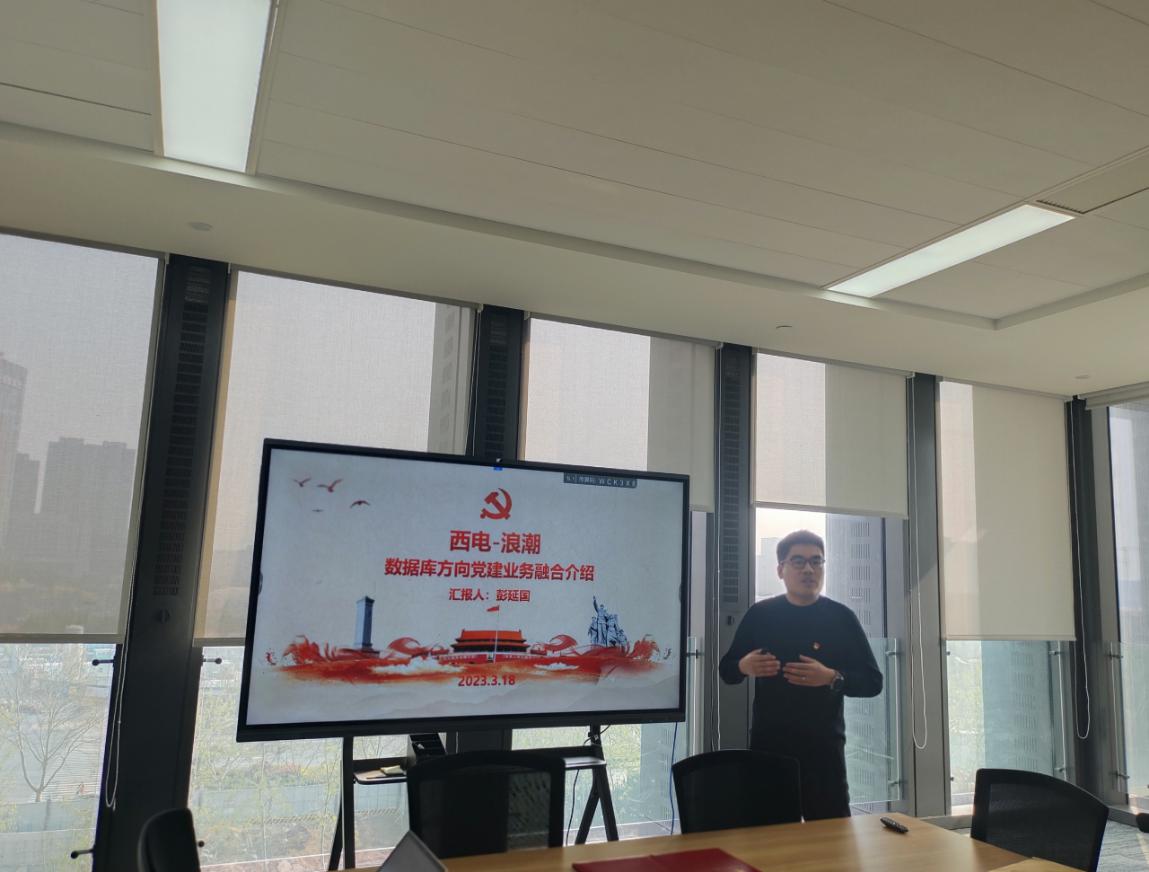 西电计科院智能媒体与数据工程研究所本硕博师第一联合党支部书记彭延国详细介绍了智能媒体与数据工程研究所本硕博师第一联合党支部的人员构成、特色活动和支部文化,就党支部所依托的学院数据库团队与浪潮集团在承担国家重大工程、科学研究、人才培养和平台建设等方面取得的成效进行了系统的介绍。