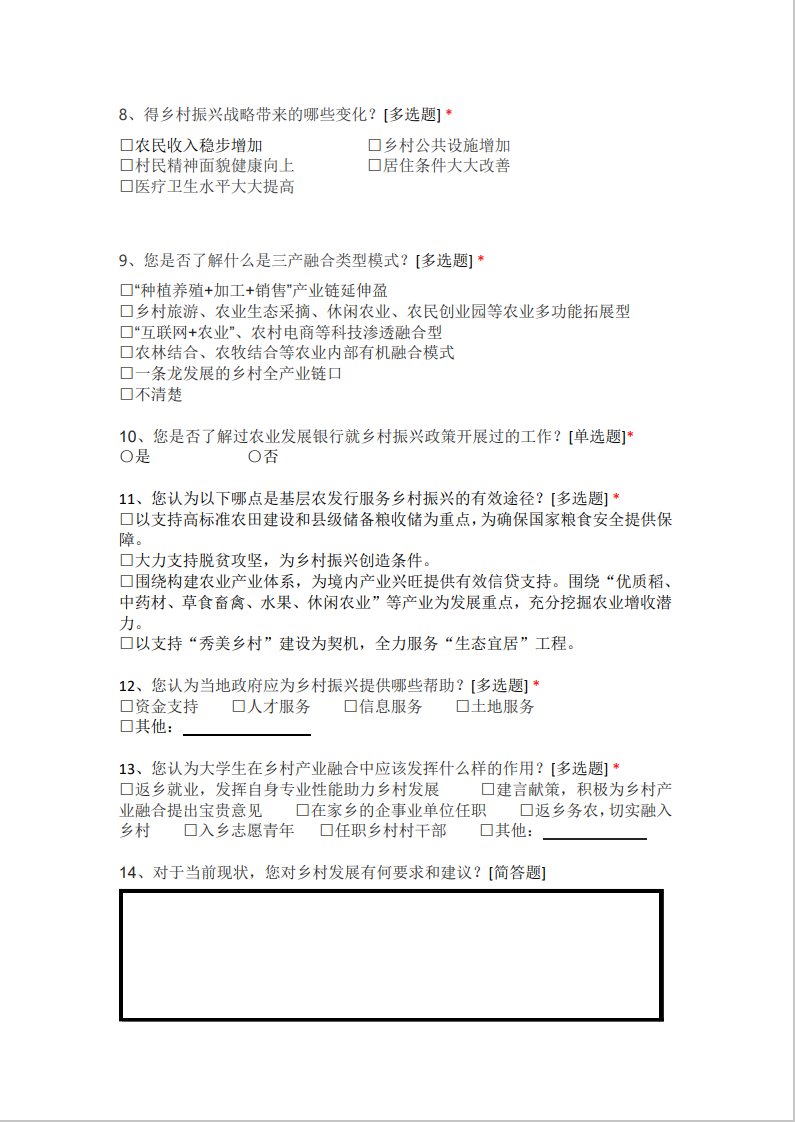 小青柠们根据对乡村振兴战略和农业发展银行工作的深入了解,精心设计编制了详实的乡村振兴需求调查问卷。在实践中,耐心地走访调查了近300户土河村的农户和仁怀市居民,以细致入微的方式收集乡村发展的实际需求,倡导宣传乡村振兴政策。