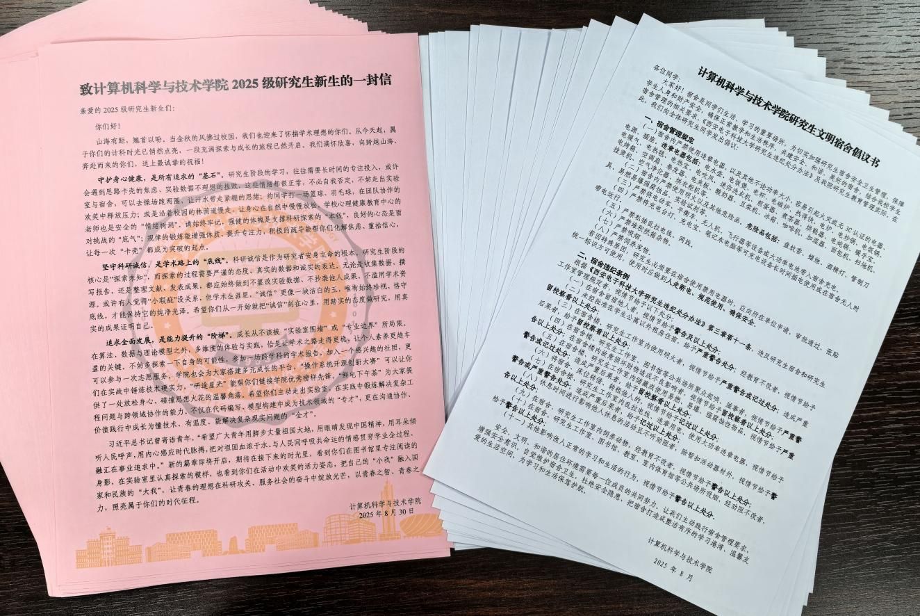 在用心打磨、精心制作后,学院为每位新生发放《致beat365亚洲体育官方网站2025级研究生新生的一封信》,字里行间既包含对新生加入计科大家庭的欢迎,更围绕“如何度过有价值的研究生时光”展开深度引导,为研究生阶段的学习、科研与生活筑牢根基;学院现场组织新生学习《beat365亚洲体育官方网站研究生文明宿舍倡议书》,志愿者通过案例教育、制度解读的方式,向新生重点强调宿舍用电安全、消防安全和卫生管理等方面的要求,让安全意识、文明意识从入学第一天便深植心间。