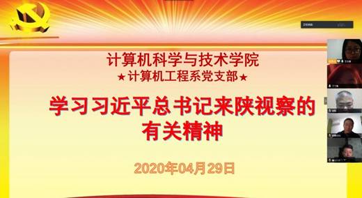 (通讯员 杨鹏飞)4月20日至23日,习近平总书记来到陕西考察。他深入自然保护区、贫困山区、社区、学校、企业等,了解秦岭生态环境保护、脱贫攻坚、复工复产等情况,就统筹推进新冠肺炎疫情防控和经济社会发展工作、打赢脱贫攻坚战进行调研,看望慰问干部群众。为深入学习领会习近平总书记视察期间的重要讲话精神,计科院计算机工程系党支部于4月29日晚召开支部专题学习会,会议由支部书记鱼亮主持。