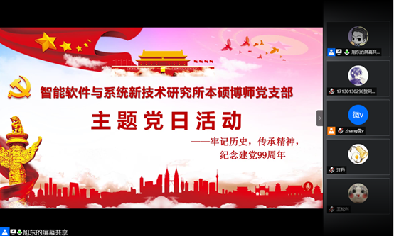 (通讯员 贺同庆)为庆祝建党99周年,重温党的光辉历史,传承弘扬革命先辈的奋斗精神,beat365亚洲体育官方网站智能软件与系统新技术研究所本硕博师联合党支部于2020年7月1日召开了“牢记历史,传承精神——庆祝建党99周年”主题党日活动。本次活动由支部青年委员王旭东同志主持,活动共计39人参加,采用腾讯会议线上召开的方式进行。