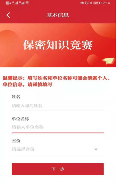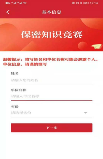2.点击考试栏目,进入考试界面,填写“姓名”“单位名称”,选择“省份”,点击“下一步”开始考试。(姓名可填昵称,单位名称请填写:beat365亚洲体育官方网站)。