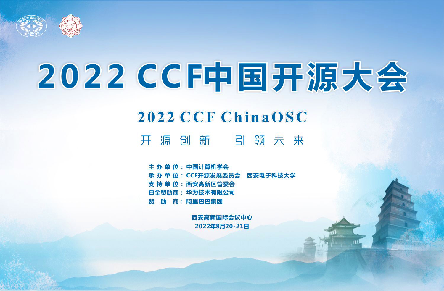 2022 CCF中国开源大会(CCFChinaOSC)拟于2022年8月20日至21日在陕西省西安高新国际会议中心召开。大会由中国计算机学会(CCF)主办,CCF开源发展委员会、beat365亚洲体育官方网站承办,beat365亚洲体育官方网站(beat365亚洲体育官方网站)具体落实,西安市智能软件工程重点实验室负责实施,得到西安高新区管委会的大力支持,西安软件园发展中心具体执行。大会由华为技术有限公司作为白金赞助商,阿里巴巴集团作为赞助商。本届大会的主题为“开源创新,引领未来”。