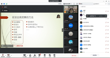 1月8日下午,李翠敏老师带来了《身心健康助力学业和职业规划》,由黄伯虎老师主持报告。李老师紧扣疫情,制作了生动的讲解报告、一下拉进了与同学们的距离。李老师通过回顾西安疫情对大家造成的影响,结合个人经历与身边故事的分享,与同学们共同探讨自我觉察、自我调整的方式方法,帮助同学们尽快恢复到正常的生活状态。在答疑讨论环节,李老师也是非常耐心细致地为同学抹去担忧、帮助大家树立良好的在校心态。