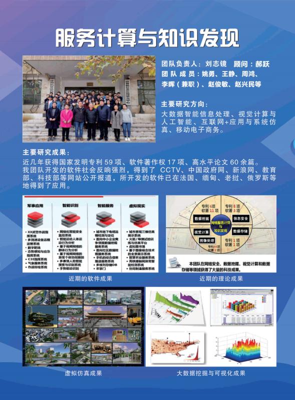 本团队核心技术主要汇聚在大数据智能信息处理、视觉计算和信息安全关键技术、移动电子商务等与应用领域。本团队的顾问为中国科学院郝跃院士。团队的主要优势在服务软件与平台的开发。在开发方面注重产品化,系统开发严格遵循软件工程开发流程与规范,近十年来开发的软件产品近50个,软件开发按期完工率为98%。