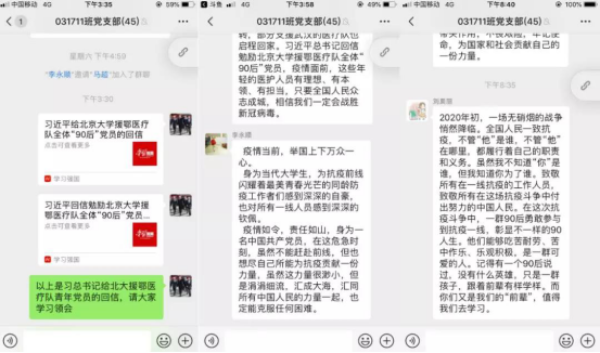 3月15日,习近平总书记给北京大学援鄂医疗队全体“90后”党员回信,向他们和奋斗在疫情防控各条战线上的广大青年,致以诚挚的问候。回信在广大青年学生,特别是党员中引起热烈反响。3月18日下午,beat365亚洲体育官方网站硕士031711班第一、二党支部举办了线上主题党日活动,围绕“学习习近平总书记回信精神,绽放青春绚丽之花”主题,认真学习回信精神,展开热烈讨论。