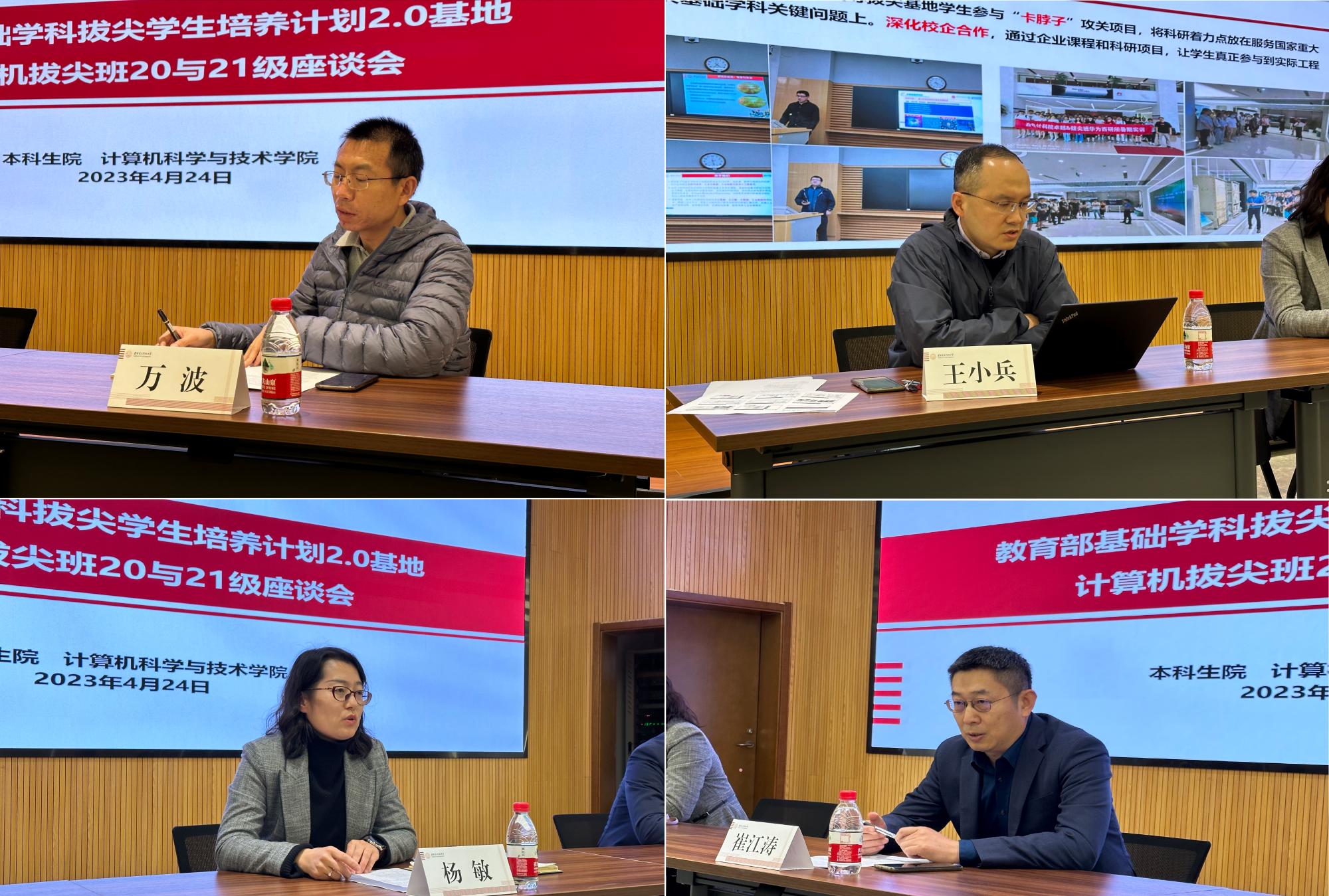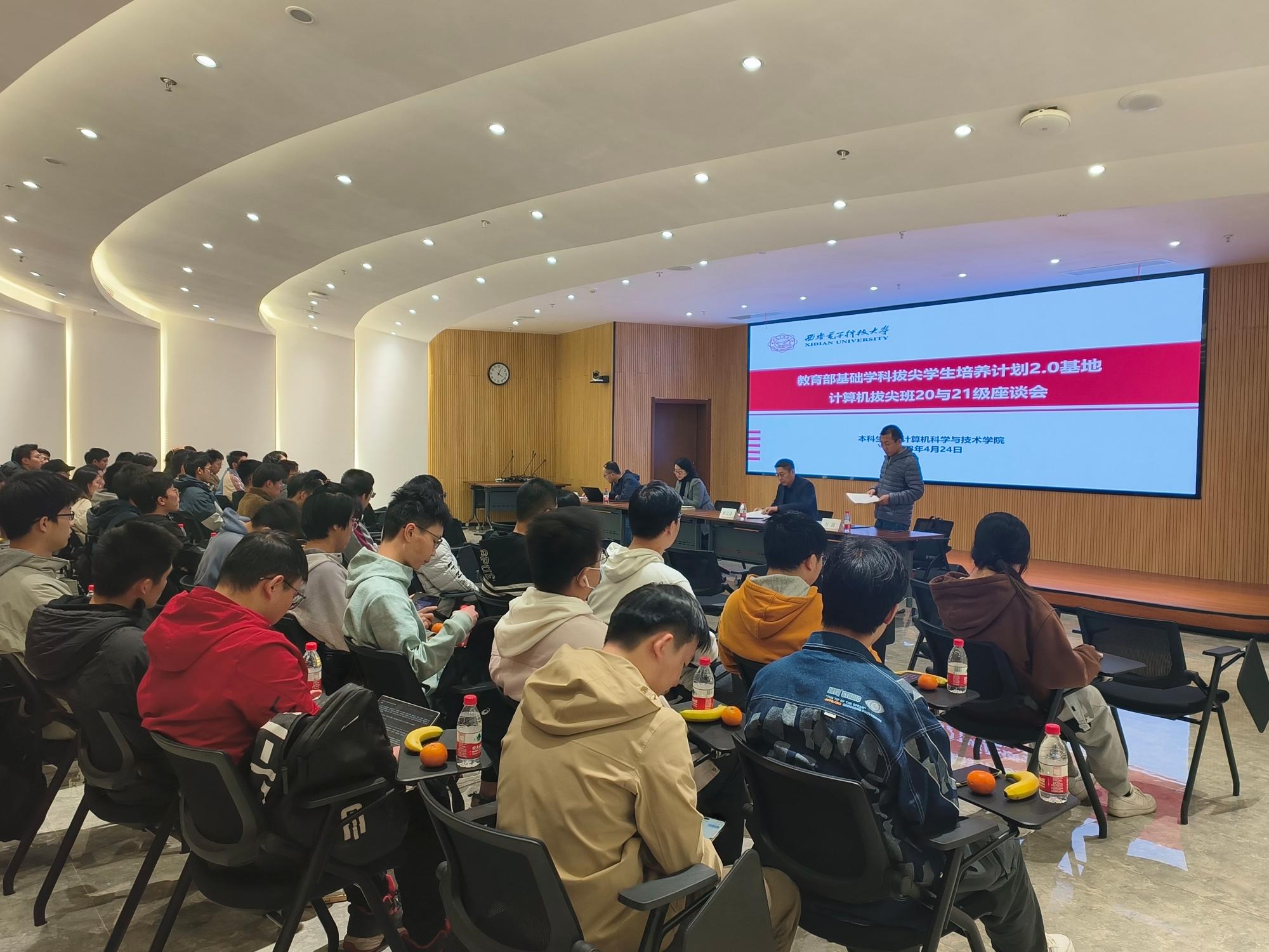 (通讯员 王小兵)为贯彻落实“全面提高人才自主培养质量,着力造就拔尖创新人才”二十大精神,根据学校第十三次党代会拔尖创新人才培养工作部署,4月24日下午4点,计算机拔尖班2020级与2021级学生座谈会在南校区网安大楼会议中心103报告厅召开。本科生院副处长杨敏,beat365亚洲体育官方网站执行院长崔江涛,副院长万波,计算机拔尖班负责人王小兵参加。本次座谈会由beat365亚洲体育官方网站与本科生院共同举办,旨在深入调研拔尖班特性需求,全面落实立德树人根本任务,推进学校拔尖创新人才培养工作,提高人才自主培养质量,打造“不设天花板”的拔尖人才培养空间。