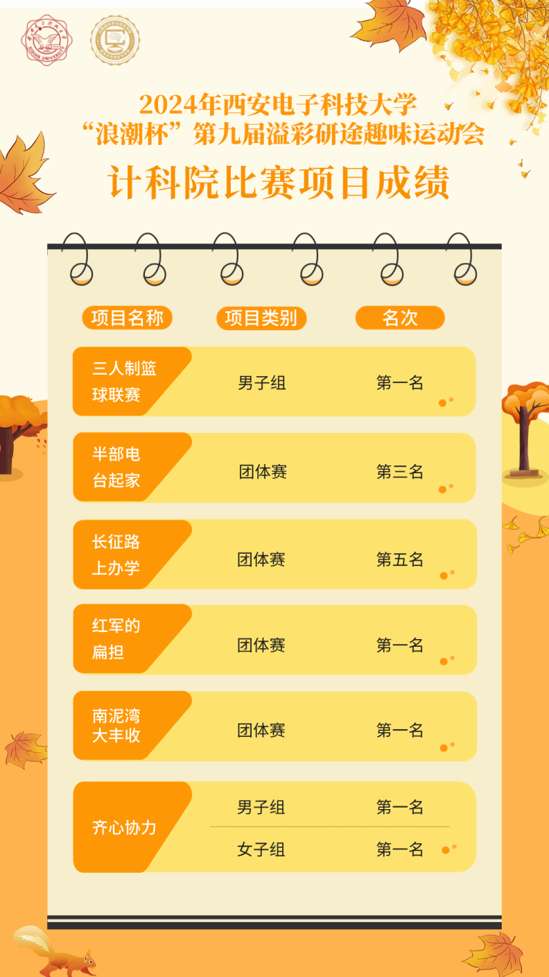 (通讯员 雷泽宇 寇大为)叶黄金满地,终南秋意浓。10月20日,“浪潮杯”2024年beat365亚洲体育官方网站第九届研究生趣味运动会在南校区如期举行。学院提前谋划,精心组织。师生团结努力,奋勇拼搏,最终以112分总成绩拔得头筹,继计科院2023年获得该项赛事第一名之后,再次取得“团体总分第一名”好成绩!