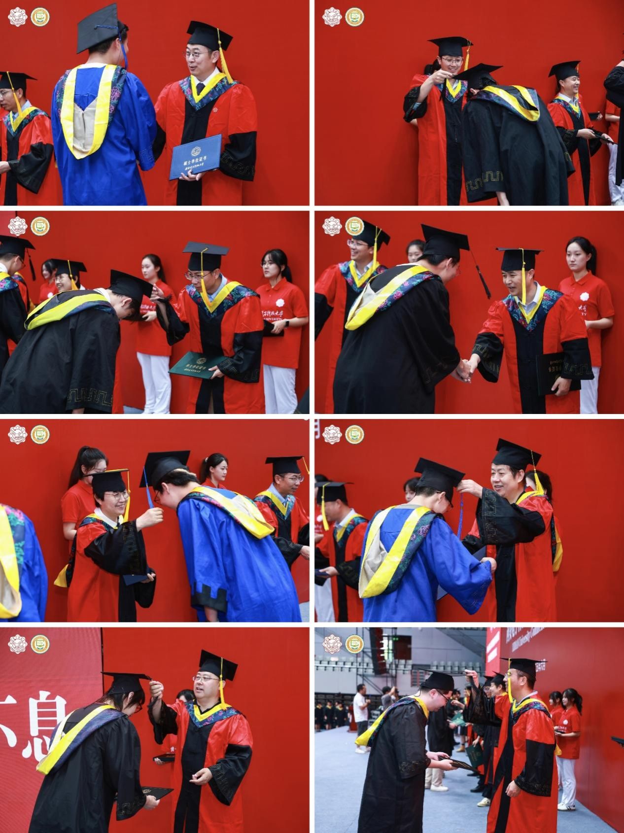 在激扬、欢快的音乐中,毕业生们整理好学位服、学位帽,排着整齐的队伍依次上台,行至面前微微躬身,向授位嘉宾鞠躬致敬,授位嘉宾一一为同学们拨穗、授位,传递着祝贺与力量,并留下了宝贵的合影。与会领导、老师,全体毕业生共同见证这神圣而庄严的时刻。