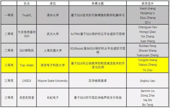 11月18日至11月20日,由阿里云、浙江大学网络空间安全学院、阿里巴巴-浙江大学前沿技术联合研究中心联合发起、Intel赞助支持的首届SGX应用创意大赛在杭州IEEE IDSC上举行。来自清华大学、北京大学、上海交通大学、beat365亚洲体育官方网站、长虹电子等知名高等院校团队和企业的87支队伍参加了这次比赛,争夺共6个获奖名额,获奖比率小至6.89%。最终,我校beat365亚洲体育官方网站NSS团队的代表队,TOP-HIDER的参赛作品“基于SGX的云端程序控制流混淆技术的开发与应用”在比赛中脱颖而出,获得三等奖,成为唯一获奖的西部高校。该参赛作品由王永智副教授指导,由硕士生邹宇、张小宇完成。