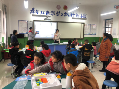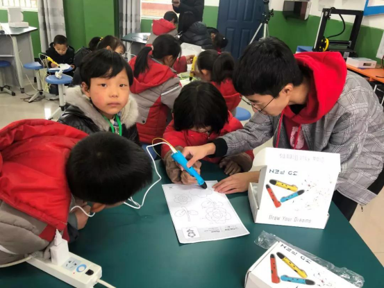 上午10点,蒲城县兴镇中心小学科创小屋科技兴趣培养课再次开讲。在beat365亚洲体育官方网站团委老师及蓝精灵志愿者同学们的指导下,小学低年级小学生们首次接触MATA机器人和3D打印笔。同学们通过对机器人进行简单编程使其完成音乐播放和按指令运动的功能。当机器人播放出悦耳的旋律以及按照规划路线绘制出相应图案时,小学生们不由自主的发出阵阵赞叹。小学生们还学习了如何使用3D打印笔。看到自己画出来的房子、火箭、自行车等图案可以直接变成实物时,小学生们纷纷感叹“这个3D打印笔也太神奇啦”。课间学院师生与小学生们积极互动,课堂气氛活跃高涨。