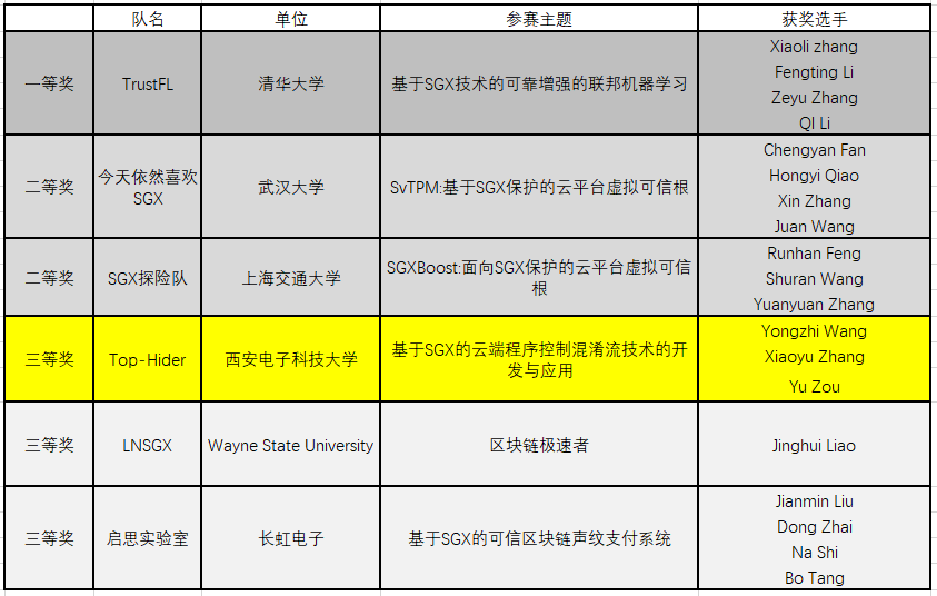 (通讯员 邹宇)11月18日至11月20日,由阿里云、浙江大学网络空间安全学院、阿里巴巴-浙江大学前沿技术联合研究中心联合发起、Intel赞助支持的首届SGX应用创意大赛在杭州IEEE IDSC上举行。来自清华大学、北京大学、上海交通大学、beat365亚洲体育官方网站、长虹电子等知名高等院校团队和企业的87支队伍参加了这次比赛,争夺共6个获奖名额,获奖比率小至6.89% 。最终,我校beat365亚洲体育官方网站NSS团队的代表队,TOP-HIDER的参赛作品“基于SGX的云端程序控制流混淆技术的开发与应用”在比赛中脱颖而出,获得三等奖,成为唯一获奖的西部高校。该参赛作品由王永智副教授指导,由硕士生邹宇、张小宇完成。