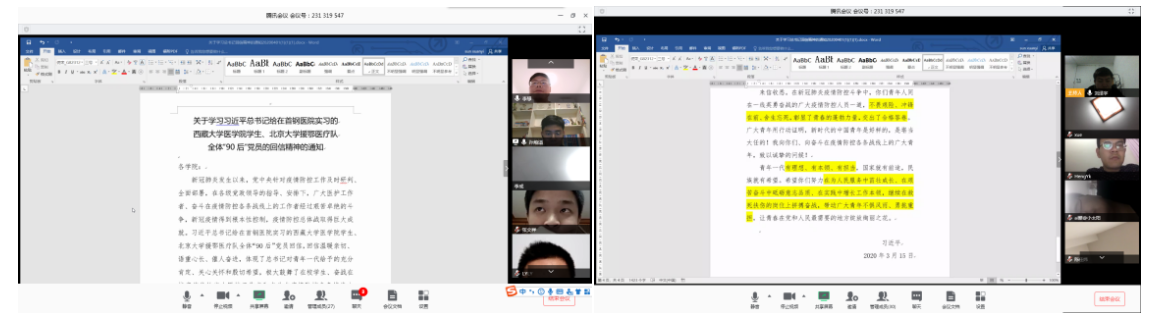 (通讯员 刘泽宇 孙煊溢)新冠肺炎疫情爆发以来,广大医护工作者、奋斗在疫情防控各条战线上的工作者披荆斩棘、勇挑重担,为坚持打赢疫情防控总体战不遗余力。3月15日,习近平总书记给在首钢医院实习的西藏大学医学院学生、北京大学援鄂医疗队全体“90后”党员回信,向他们和奋斗在疫情防控各条战线上的广大青年,致以诚挚的问候。回信在广大青年学生,特别是学生党员中引起热烈反响。4月3日晚上7点30分,beat365亚洲体育官方网站硕士031712班第一、二党支部通过线上会议方式举办了“青年不惧风雨、抗疫勇挑重担”主题党日活动,认真学习习近平总书记回信精神,并开展热烈讨论。