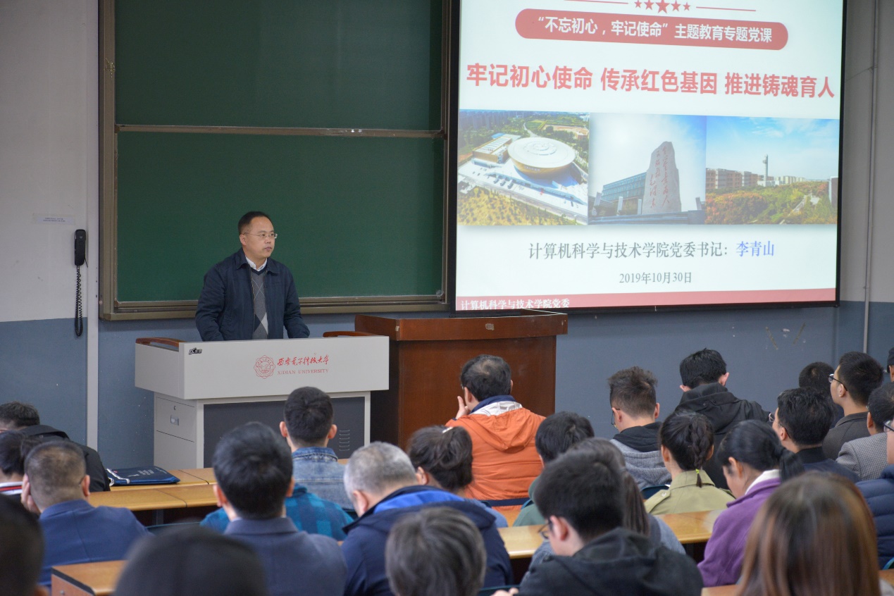 崔江涛为全院师生党员带来“新形势下计科人的初心和使命”专题党课。习近平总书记指出,中国共产党人的初心和使命,就是为中国人民谋幸福,为中华民族谋复兴。作为新时代的共产党员要不忘初心跟党走。他从共产党人的初心和使命延续到计科人的初心和使命,结合学院历史沿革、新形势和新挑战下的建设目标与任务等,详细讲解了学校人才强校相关政策精神,对学院人才引进、青年教师培养的现状进行了总结。他谈到,学院会贯彻落实好学校出台的各项好政策,尽最大努力引进和培养优秀人才。同时,学院将继续深入调研,充分听取一线教职工的意见建议,不断优化学院四定及绩效分配工作,切实解决教职工关注的重点问题。