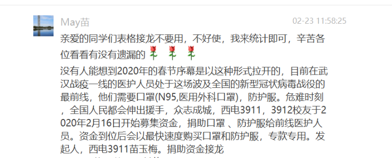 院友迅速响应,积极捐款献爱心。2月16日,苗玉梅发起班级内募集资金活动,3911、3912班院友热情响应,很多海外同学也通过各种途径第一时间参与捐款。爱心如潮,点滴爱心汇成抗“疫”暖流。截止2月26日下午,已募集40260元善款,捐款数额还在持续增加中。