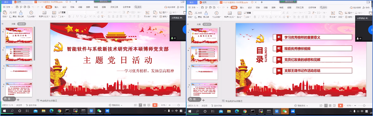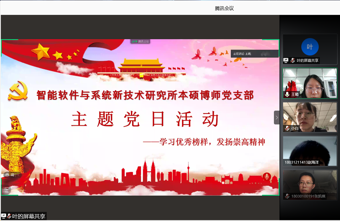 (通讯员 张凯琪)为了深入贯彻习近平总书记关于学习老一辈工作楷模、传承“五老”精神的重要指示,学习和发扬老一辈优秀榜样的崇高精神,beat365亚洲体育官方网站智能软件与系统新技术研究所本硕博师联合党支部于2020年11月27日下午开展了“学习优秀榜样,发扬崇高精神”主题党日活动。活动由支部青年委员叶国强同志主持,共计47人参加,采用腾讯会议线上召开的方式进行。