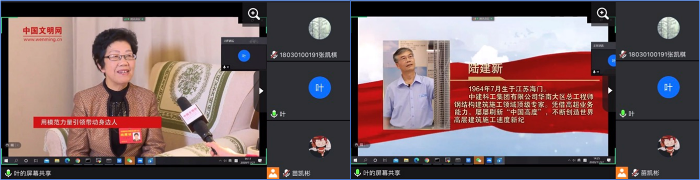 活动开始,全体党员同志观看了四个老一辈道德模范人物的采访视频。中国核潜艇之父、全国道德模范黄旭华院士牺牲了陪伴家人的时间,换来了国家战略核潜艇的问世,表示作为共产党员,对国家的忠就是对父母最大的孝;全国诚实守信模范呼秀珍同志是一名兢兢业业的优秀教师,她指出志向是人生的航标,而和党和人民的利益联系在一起的志向是各种志向的底盘;全国道德模范钱七虎院士捐献了他曾获得过的全部奖金,扶助贫困学生,帮助困难群众,履行着一位共产党人为共产主义事业奉献终生的誓言,他表示共产党人追求的不是个人的名利,而是为人民作贡献,所以我们不需要奢侈的生活;全国道德模范陆建新同志先后参与建设44项工程,工程总高度达3600余米,37年风雨兼程,37年驰骋工地,淡泊名利,敬业奉献,续写新时代工匠精神的新篇章。