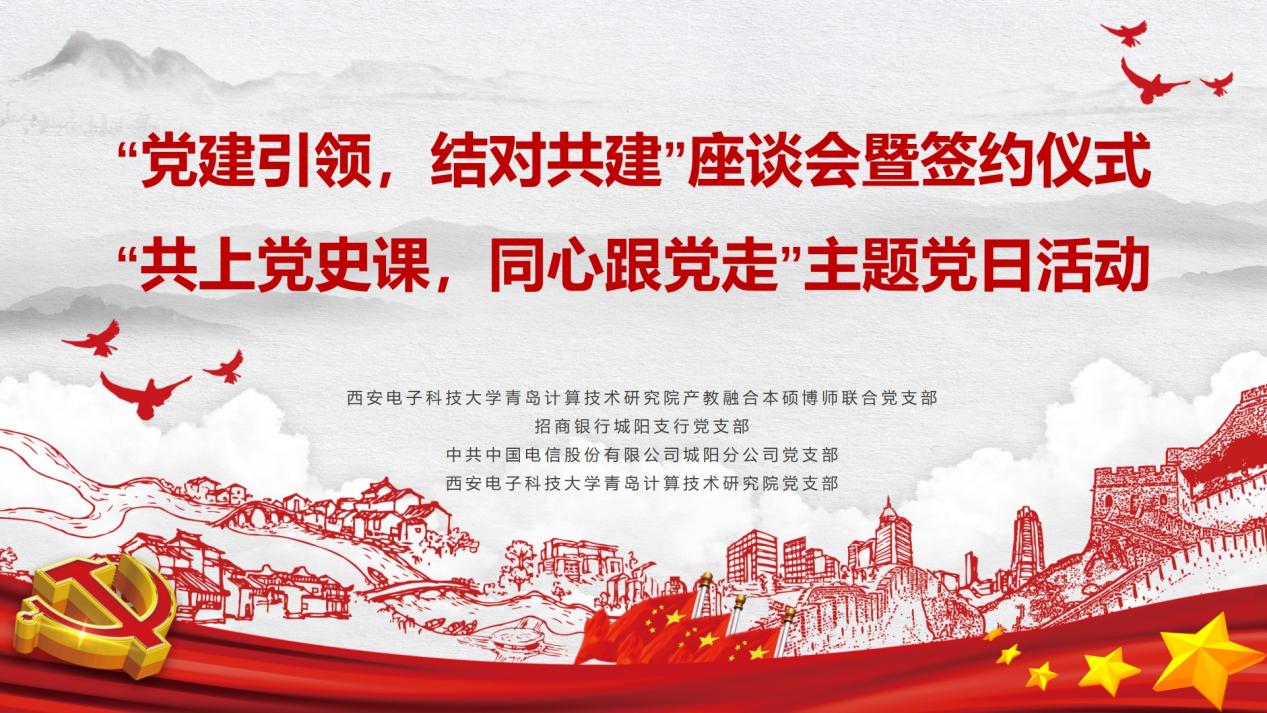 (通讯员 同榛)为认真学习贯彻习近平总书记在党史学习教育动员大会上的重要讲话精神,按照校院两级党史学习教育相关方案要求,beat365亚洲体育官方网站党委提前谋划,西电青岛计算技术研究院产教融合本硕博师联合党支部主动对接,与西电青岛计算技术研究院党支部、招商银行城阳支行党支部、中共中国电信股份有限公司城阳分公司党支部结对共建。beat365亚洲体育官方网站党委书记李青山、党委副书记张莹莹等一行5人赴西电青岛计算技术研究院参加了结对共建活动。