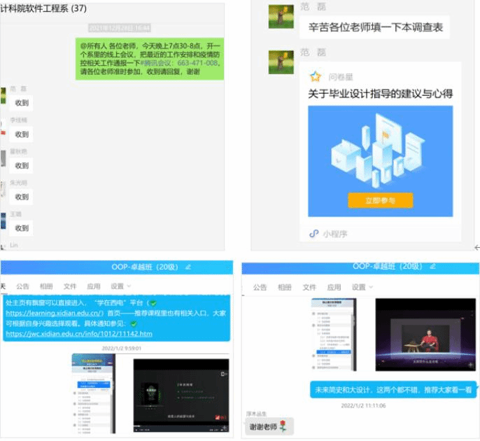 软件工程系紧急召开全体教师会议,党支部书记、系主任褚华强调了目前西安市疫情形势的严峻性,传达了学院疫情防控和教学、科研相关工作安排,全体教师在积极配合疫情防控要求、做好自我防护的基础上,要多关心学生的学习、生活和心理状况,针对本科生,做好非毕业年级线上辅导工作,保证每周一次线上答疑活动;安排好毕业年级学生的毕业设计开题工作,每周和学生讨论一次工作进展,督促学生按计划开展毕业设计工作等。针对研究生,导师要关心其生活和心理状态,并督促其继续进行科研工作。会议面向全系发起疫情防控工作动员,党员要充分发挥模范带头作用,各位老师在条件允许的情况下积极参与疫情防控和服务保障工作。
