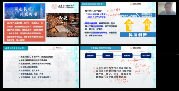 本科课程《系统分析与设计》中,褚华老师深情讲述了“西电智课”——保障学校线上教学平稳推进的关键平台,从上线、运行、再到维护,背后发生的许多感人却不为人知的故事。不仅从知识的角度帮助学生建立起对软件系统开发的感性认识,更是用自己和所有为奋战在抗疫第一线的西电人的实际行动,激励学生发扬、传承“西电精神”,学以致用、用信息技术筑起坚实的“防疫墙”。