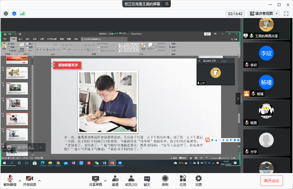 随后,支部党员同志分享了校内外优秀党员先锋模范的故事。马国臣分享了人民楷模老兵朱彦夫抗美援朝的故事,胡雅宣分享了大学生村官刘亚妮的故事,李欣分享了全国优秀共产党员王涛带领村民致富的故事,康宇翰分享了57岁洪山下沉党员肖红华的下沉故事,高向阳追忆了特级战斗英雄杨根思,方宇为大家介绍了永葆党员初心的军人张连印,支部副书记杨瑾为大家带来了冲锋在一线的反诈尖兵康飞的故事,邸维高分享了全国模范法官杨军的故事,杨勇讲述了回村当农民的开国将军—甘祖昌的故事……故事中的党员同志们在他们自己的岗位上发挥着自己的光和热,他们的精神深深的感动和激励了支部的党员同志们。