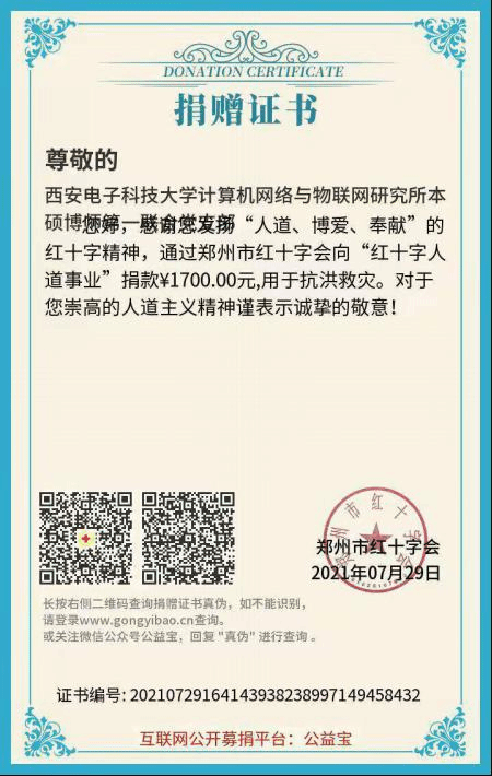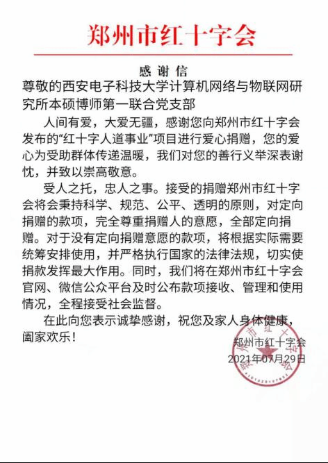 灾情深深牵动着每一个中国人的心,7月24日,beat365亚洲体育官方网站计算机网络与物联网研究所本硕博师第一联合党支部发起“防汛抗洪驰援河南”募捐倡议,倡导大家尽自己所能献出一份爱心,以实际行动支持河南防汛救灾。该倡议得到支部党员们的积极响应,截至日前,计算机网络与物联网研究所本硕博师第一联合党支部共筹集到了1700元善款。该善款已汇至河南省郑州红十字会账户,用于抗洪救灾工作。
