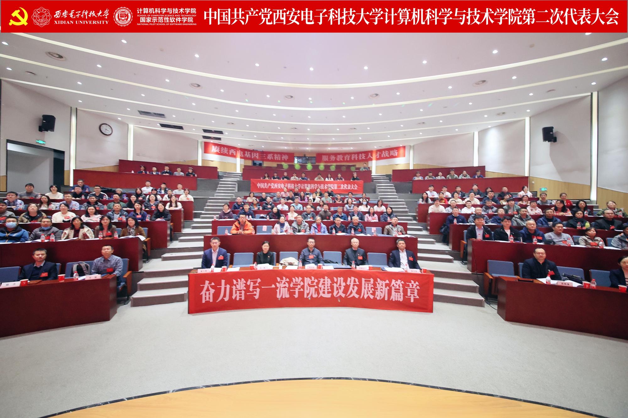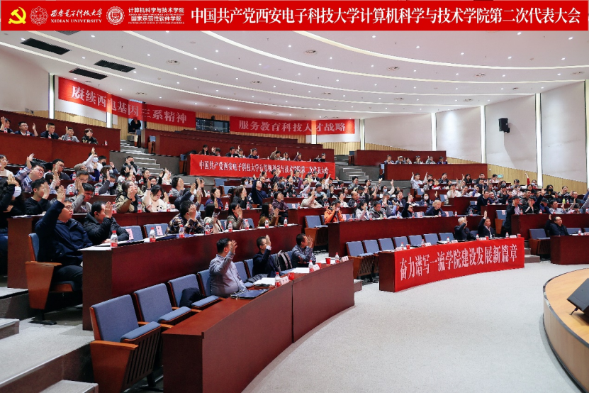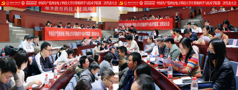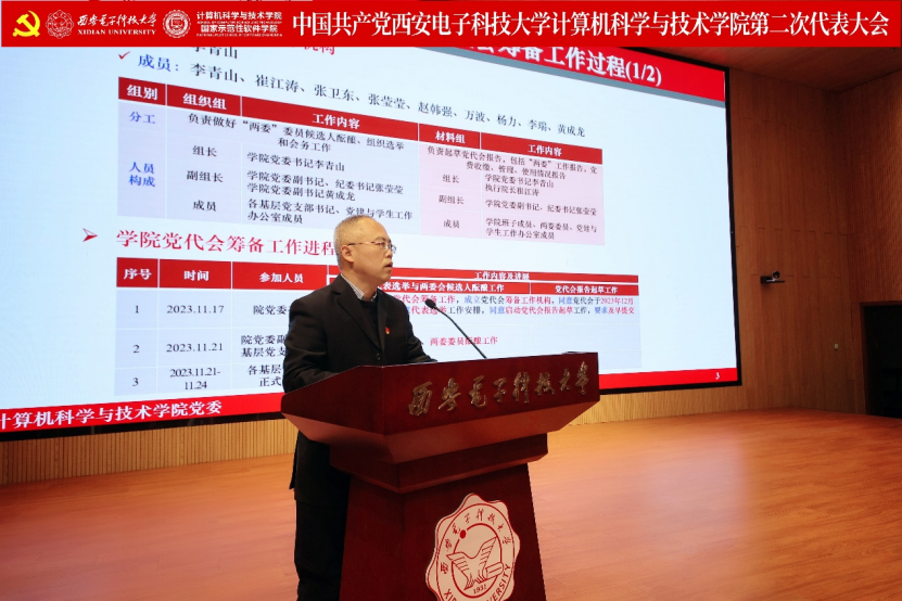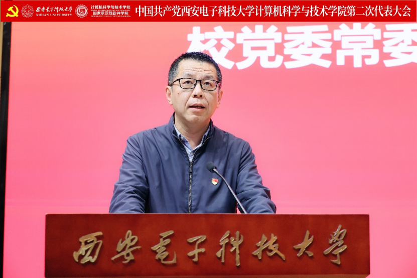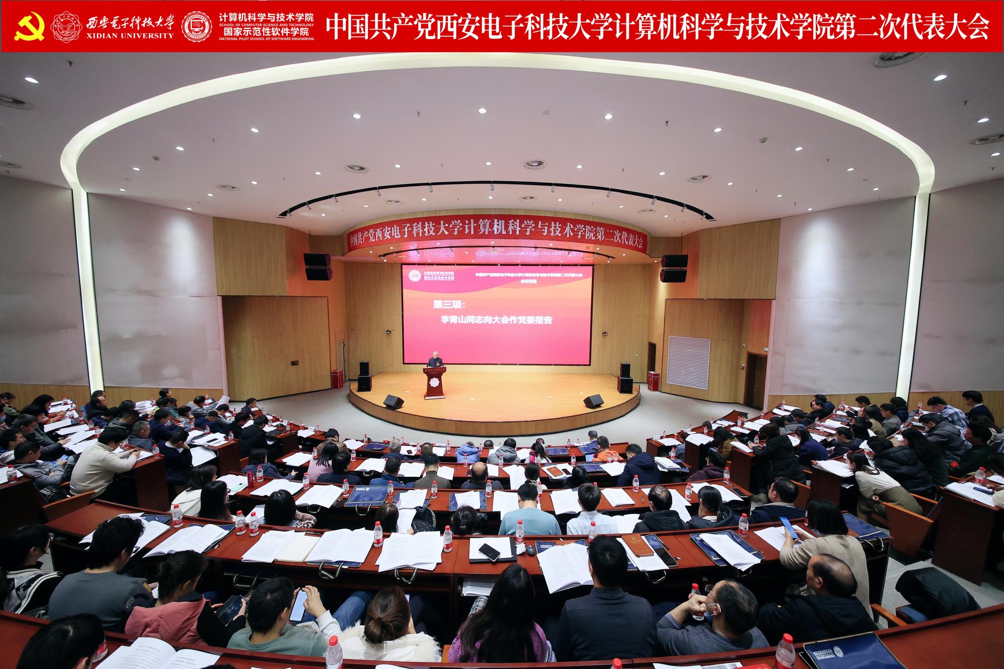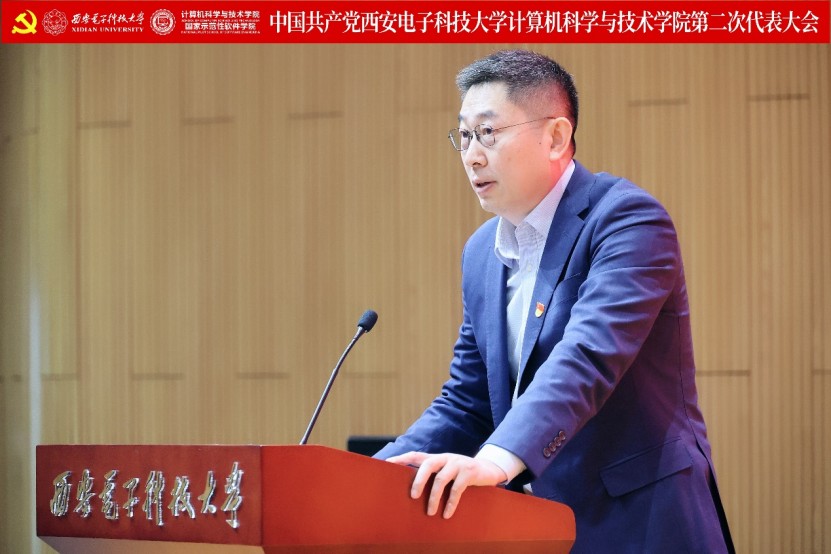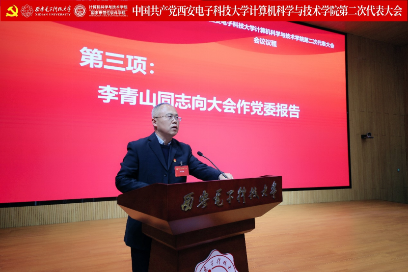 李青山代表学院第一届党委向大会作了题为《赓续西电基因三系精神 服务教育科技人才战略 奋力谱写一流学院建设发展新篇章》的报告。报告总结了学院第一次党员代表大会以来的主要工作,分析了当前学院面临的形势和目标任务,进一步指明了学院改革发展的前进方向。大会号召学院全体党员和教职员工紧密团结在以习近平同志为核心的党中央周围,高举习近平新时代中国特色社会主义思想伟大旗帜,全面贯彻落实党的二十大精神,贯彻落实学校第十三次党代会精神,在学院第二届党委的坚强领导下,传承西电红色基因,赓续三系精神,落实好“八个西电”建设任务,奋力谱写一流学院建设发展新篇章,为教育强国建设和民族复兴伟业贡献西电计科力量。