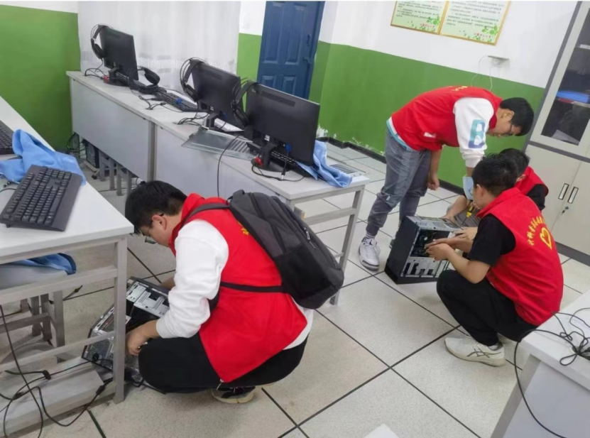 黄伯虎老师指导带领志愿者同学们为小学微机室60余台设备进行了检查、维护、维修、升级,解决显示器损坏、主机电源损坏等各类问题,并对暂时不能解决的设备损坏问题做了详细记录,为后续维修做好准备。