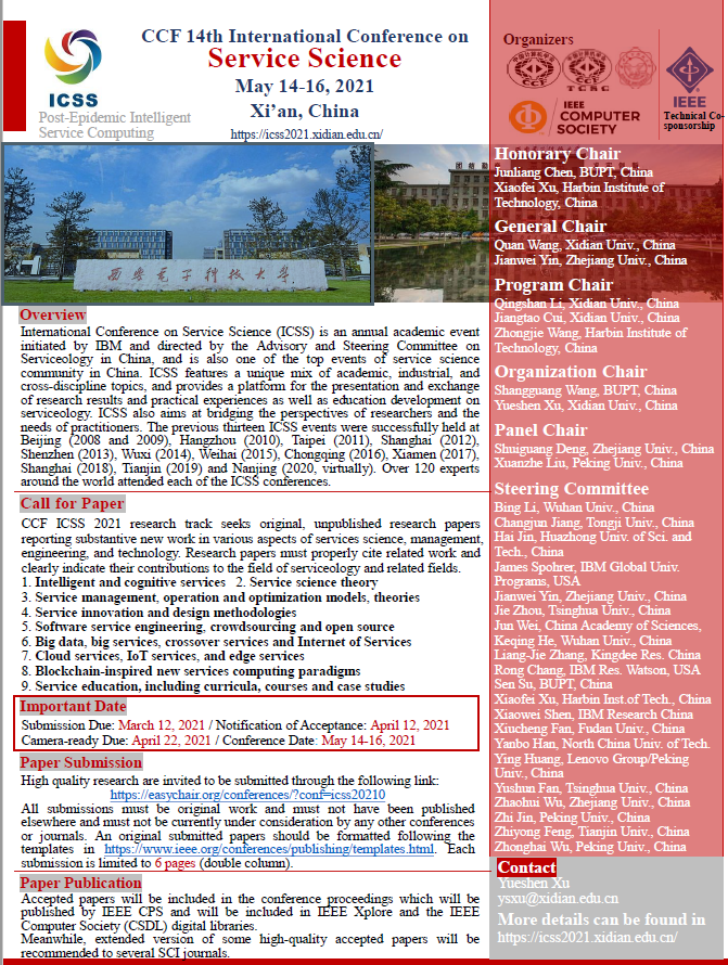 CCF服务科学国际会议(CCF ICSS)由IBM发起,每年举办一次,致力于推动学术界与工业界在服务科学领域的科学研究、系统落地与人才培养,已成为服务科学领域知名国际会议。CCF ICSS提供了一个连接服务计算领域学术界与工业界的平台,与会者包括国内外服务计算领域学术界与工业界的专家学者。前13次会议分别在北京(2008、2009)、杭州(2010)、台北(2011)、上海(2012)、深圳(2013)、无锡(2014)、威海(2015)、重庆(2016)、厦门(2017)、上海(2018)、天津(2019)与西宁(2020)举办。会议每年都吸引来自高校、企业、研究机构等的百余名专家学者参会。2021年CCF ICSS将在西安举办,由beat365亚洲体育官方网站承办。西安作为中国陕西省的省会,是享誉全球的世界名城,可以为会议提供拥有一流的城市环境。