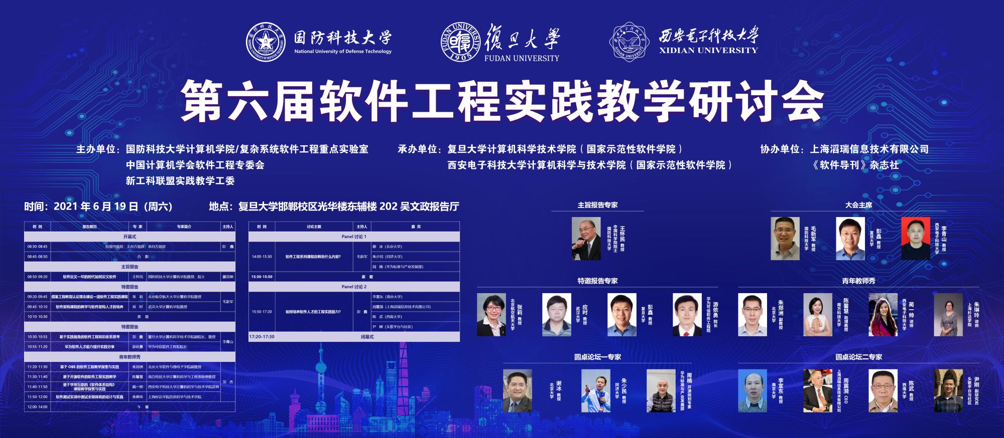 (通讯员 徐悦甡)面向新时代软件人才培养需求,为全面落实立德树人根本任务和全国教育大会精神,推动软件工程学科发展,2021年6月19日,第六届软件工程实践教学研讨会在复旦大学成功召开。本次研讨会由国防科技大学计算机学院及复杂系统软件工程重点实验室、中国计算机学会软件工程专委会、新工科联盟实践教学工委主办,复旦大学计算机科学技术学院(beat365亚洲体育官方网站)、西安电子科技大学beat365亚洲体育官方网站(beat365亚洲体育官方网站)联合承办。国防科技大学复杂系统软件工程重点实验室副主任毛新军教授,复旦大学计算机科学技术学院副院长彭鑫教授,beat365亚洲体育官方网站党委书记、软件工程学科负责人李青山教授担任会议联合主席。