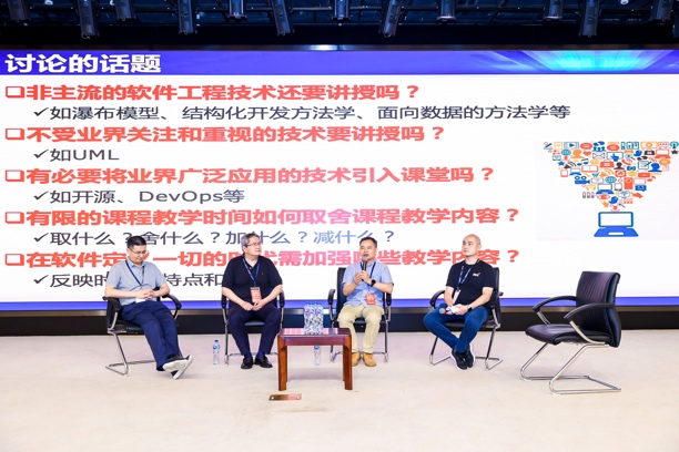 圆桌论坛一围绕“软件工程系列课程应教些什么内容”这一主题,邀请了北京大学谢冰教授、同济大学朱少民教授、华为标准与产业发展部周楠博士等专家学者参加讨论。论坛由国防科技大学毛新军教授主持。论坛具体针对“非主流的软件工程技术还要讲授吗?”、“不受业界关注和重视的技术要讲授吗?”、“有必要将业界广泛应用的技术引入课堂吗?”、“有限的课程教学时间如何取舍课程教学内容?”、“在软件定义一切的时代需要加强哪些教学内容?”等五个问题展开讨论。毛新军认为应该选择性地讲授非主流的软件工程技术和方法,业界不受关注的技术和方法主要取决于培养目的,有必要将开源软件及技术引入到课堂教学和课程实践,课程内容的取舍取决于教学目的,在软件定义一切的时代需要关注软件伦理问题、人机物融合系统等。谢冰认为应该关注于讲授基础知识与基础技能,强调教训结合。朱少民认为教学内容的取舍取决于培养计划,应该以学生学习为中心进行软件工程课程设计,强调实训的重要性。周楠从企业实践的角度探讨了软件工程技术是否过时的定义、以及如何将企业问题与教学相结合。