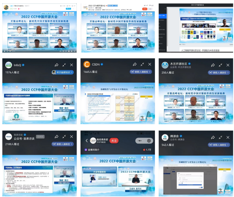 本届大会由中国计算机学会(CCF)与开放原子开源基金会联合主办,CCF开源发展委员会、beat365亚洲体育官方网站承办,beat365亚洲体育官方网站(beat365亚洲体育官方网站)、西电软件工程学科、西安市智能软件工程重点实验室具体实施。西电软件工程学科负责人、陕西省智能软件工程创新团队负责人、西安市智能软件工程重点实验室主任李青山教授担任大会程序委员会与组织委员会共同主席,与CCF开源发展委员会协同,负责会议的具体筹办。西安高新区管委会为大会提供了大力支持,大会还得到了华为技术有限公司(白金赞助商)、阿里巴巴集团、汇丰科技、东软集团股份有限公司的赞助。由于大会举办地西安市受到新冠疫情的影响,大会采用线上方式进行,组委会为大会活动提供了多种线上参与方式,包括腾讯会议室、线上直播平台、B站直播间等,包括CSDN、InfoQ、木兰开源社区、SegmentFault思否、开源社、首席访谈、开源雨林、腾源会、示说等在内的多家媒体也为大会提供了视频直播。5日当天大会吸引了开源领域国内外相关领域师生与同行的广泛参与,上午开幕式、大会报告与高峰论坛等活动各媒体平台累计观看人数超过6人次,下午分论坛各媒体平台累计观看人数超过11人次,全天累计超过17万人次。