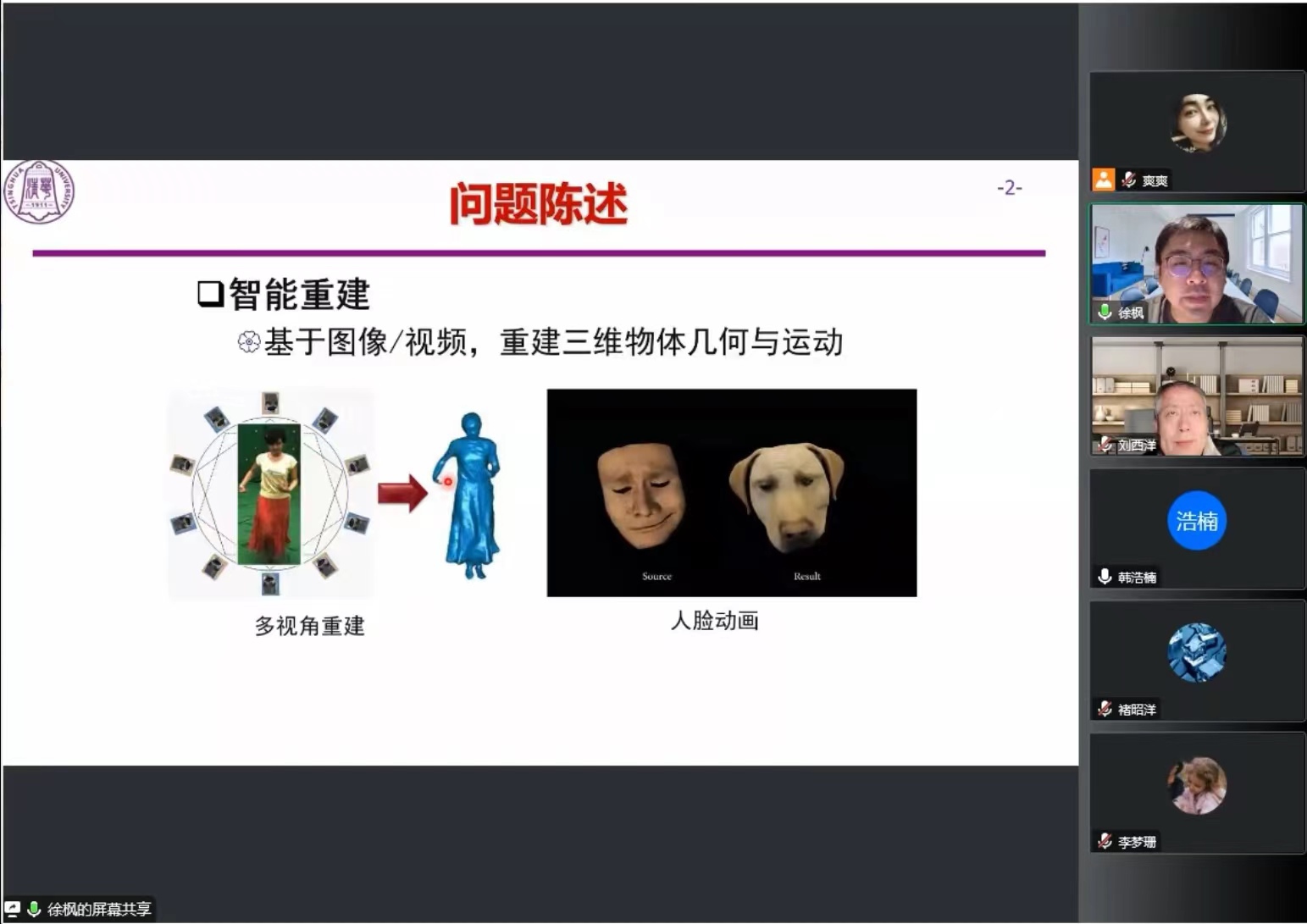 11月1日晚上,徐枫副教授作学术报告,主题为“从智能重建到智慧医疗”。主要介绍计算机图形学中的人脸重建及动画技术在数字医疗中的应用,以及对眼部疾病诊断时病人隐私保护等技术。他介绍了相关的智能重建技术以及相关技术与医学交叉产生的机缘和契机,并介绍在医学应用的具体方法和相关实验。他从计算机学科研究人员如何实现成功的医工交叉研究的角度,为参会师生分享了自己的经验和感悟,并与参会师生展开讨论。