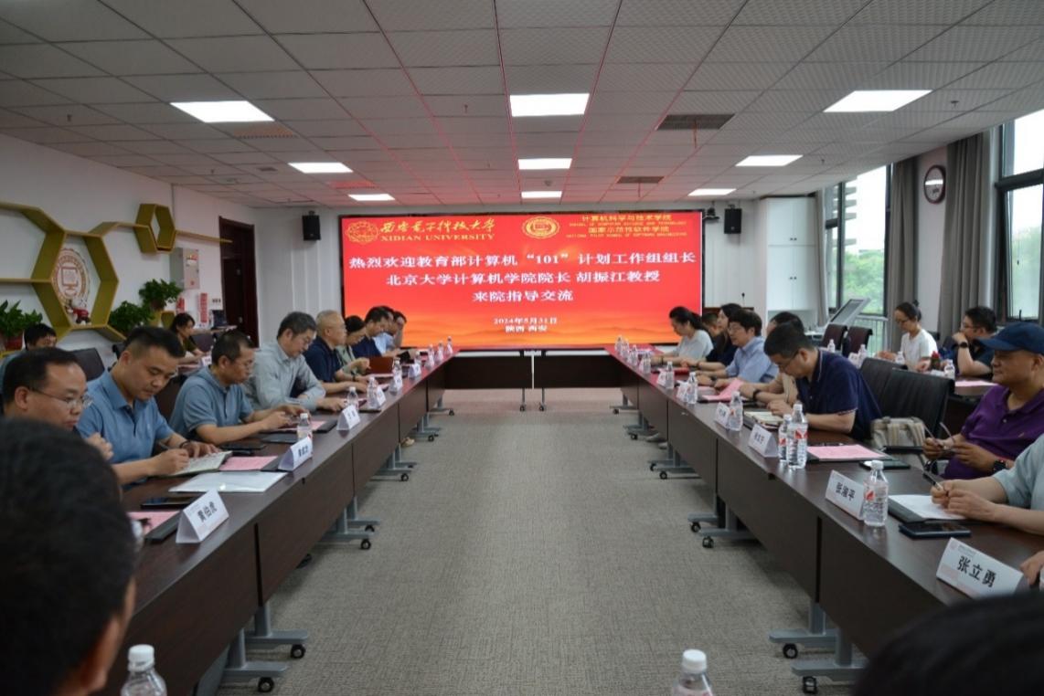 学院执行院长崔江涛从历史沿革、学科建设、师资队伍、人才培养、科学研究等方面对学院的建设发展情况进行了介绍;教学副院长万波介绍了学院参与 “101计划”工作情况和取得的建设成效;万波、褚华、李辉作为《程序设计基础》、《软件工程》和《数据库系统》三门核心课程的负责人,对课程建设情况进行了汇报。胡振江教授认真听取了汇报,肯定了学院的发展和课程体系建设成效,表示西电beat365亚洲体育官方网站的人才培养很有特色,希望将来加强北大计算机学院与西电计科院的交流学习。